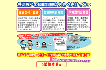 お受験7では、小学校受験を志す方々の「道しるべ」として 毎回の模試で各学校の出題の傾向を的確にとらえた問題の提供と、行動観察においては、細かな採点シートを用いて、 より詳しい結果表をお出しする事で